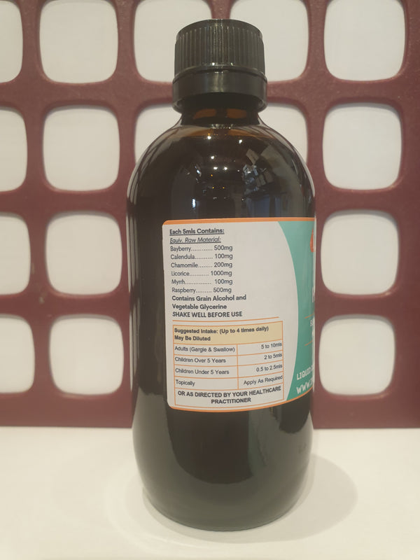 May be taken people experiencing the following: Infections and inflammations of the mucous membranes (Can be used topically) Gingivitis Bleeding gums Mouth ulcers Thrush – oral, intestinal and vaginal (used locally and/or systemically) Tonsillitis (gargle and internal) Active Ingredients: Bayberry Calendula Chamomile Licorice Myrrh Raspberry Recommended Administration:Adults 5mls to 10 mlsChildren under 5 years 0.5ml to 2.5 mlsChildren over 5...